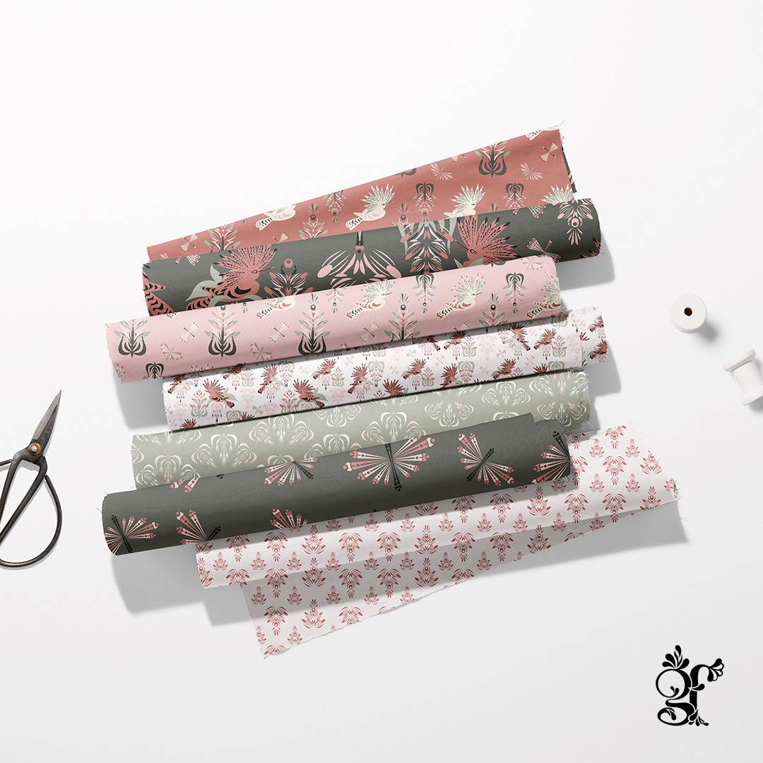Je créer pour des domaines variés (déco, textile, mode…) et propose des motifs sur mesure ainsi que du licensing, via un catalogue accessible aux professionnels.